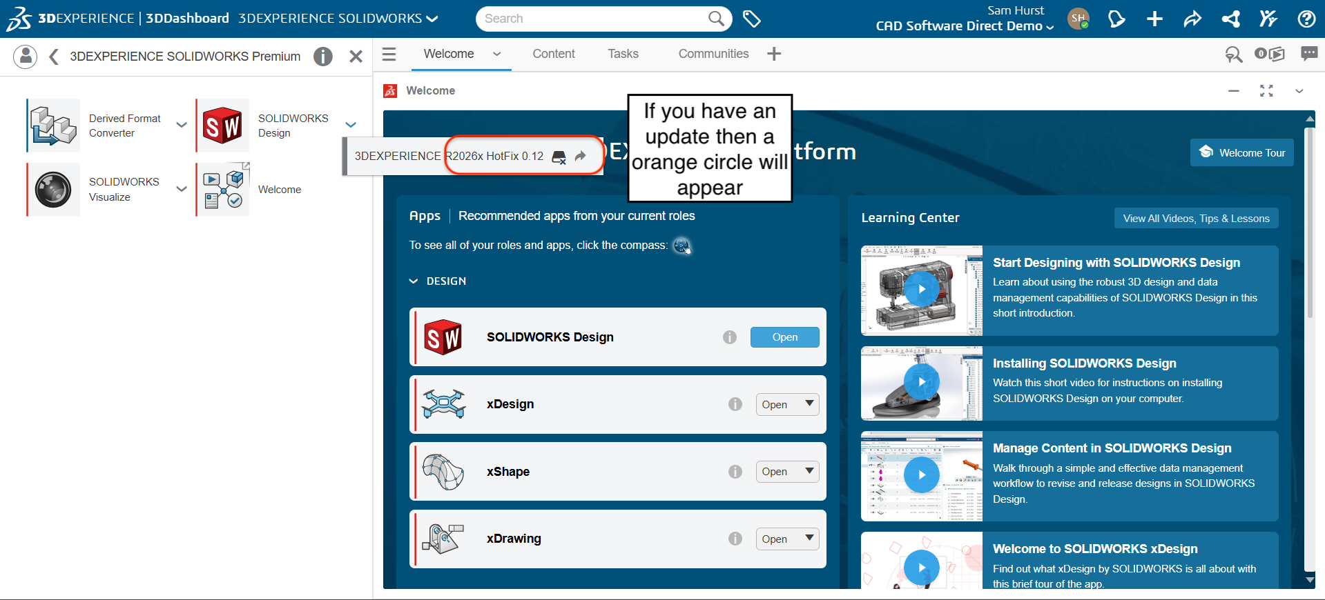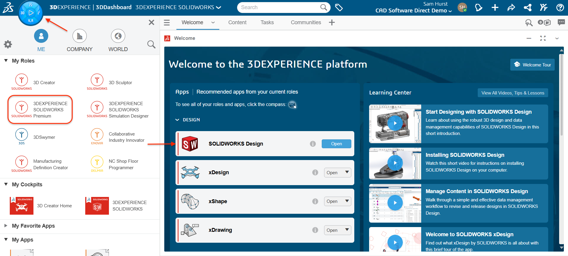 Now you are into your portal there is a lot going on for first time users, the best place to start is to click the Blue compass in the top left hand corner, from here find your Solidwork subscription either under My Roles or My Apps. This should also show in your Welcome tab.