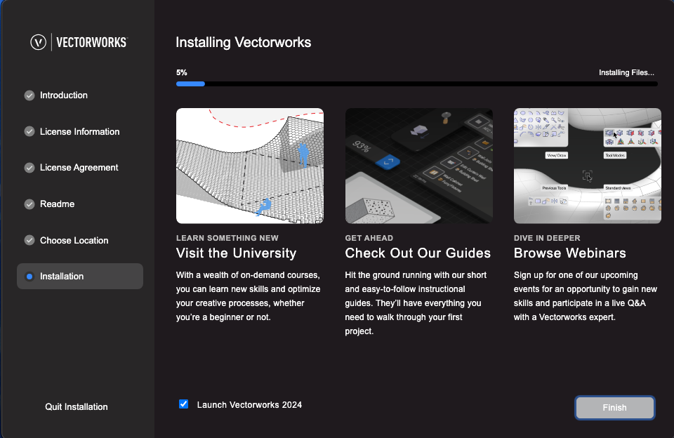 Once everything has been agreed and the install has completed you will be asked to log into the portal to verify a connection and then you are done and can start using Vectorworks!